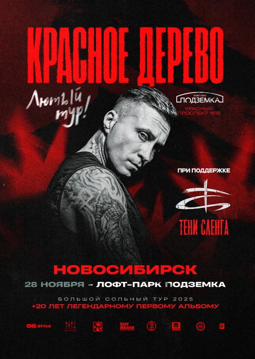 Друзья! 28 ноября лофт-парк "Подземка" большой концерт Миши Краснодеревщика, при поддержке группы Тени Сленга! Это будет самое громкое шоу, всем строго быть! Начало в 19:00 Билеты по ссылке 👇 https://afisha.yandex.ru/novosibirsk/concert/krasnoe-derevo-2025?source=selection-events&filterDates=2025-11-28%2C+1&filterDict=date%3D2025-11-28%26period%3D1&rubric=index&refererSurface=filters