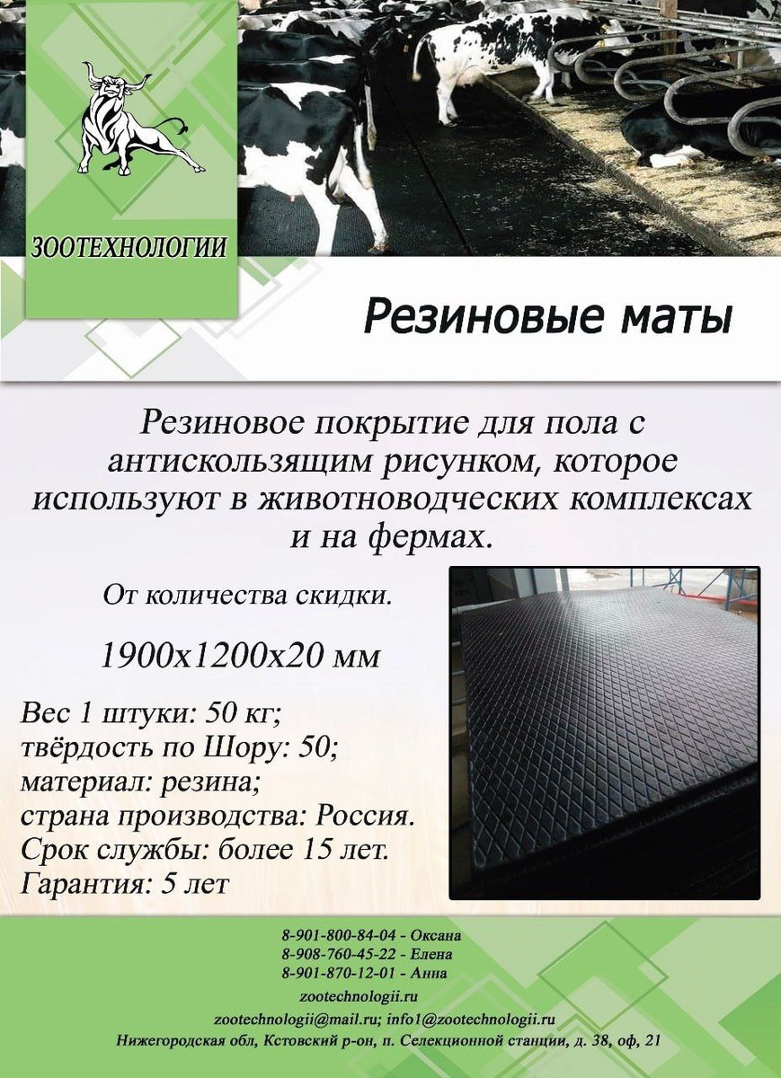 🛠️ В продаже маты для КРС размером 1900х1200х20 мм, которые используются в качестве напольного покрытия в животноводческих комплексах и на фермах. Некоторые области применения: 🔜Стойла для привязного содержания животных. 🔜Лежаки для беспривязного содержания. 🔜Проходы усиленной нагрузки (например, между накопителем и доильным залом). 🔜Поверхности с мобильным навозоудалением (дельта-скрепер). 🔜Залы-накопители. 🔜Проходы. 🔜Доильные залы (помещения со сложной конфигурацией пола). 🔜Помещения для молодняка, телятники. Маты обеспечивают комфортную нагрузку на опорно-двигательный аппарат животных, сохраняют лёгкость движения, предотвращают болезни суставов. Узнать точную стоимость с учетом доставки до Вас, можно у наших менеджеров: Оксана: 8-901-800-84-04 Елена : 8-908-760-45-22 Анна: 8-901-870-12-01 Юлия: 8-902-787-47-33 Читайте нас в Дзен (https://dzen.ru/zooteh) 🧡 #Плита #Резина #Коврики