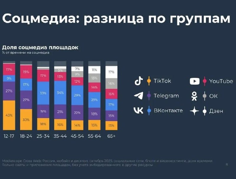 YouTube удержал место в топ-4 соцсетей в России, несмотря на замедление и постоянные ограничения. Платформа по-прежнему остаётся одной из самых популярных — даже давление на скорость не смогло выбить её из рейтинга. 💬 @Mikhaylov_Review