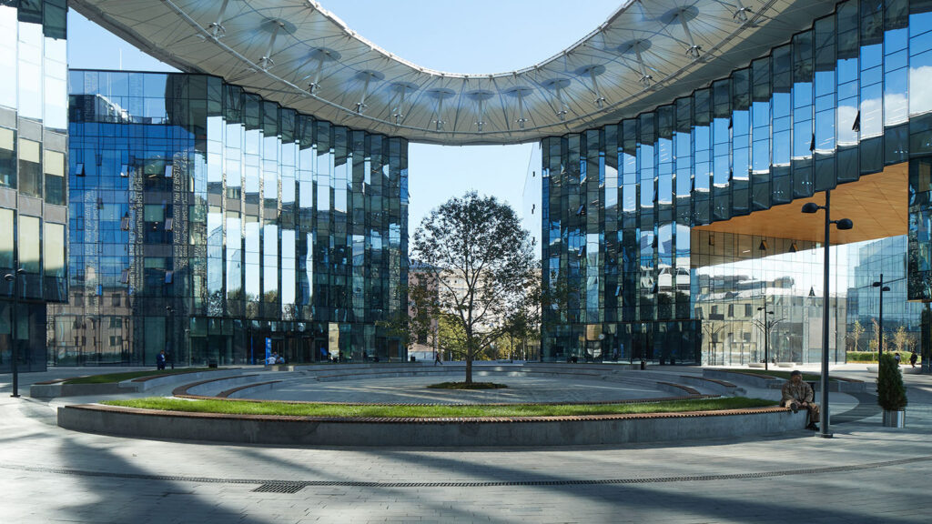 Центральной точкой нового квартала стал амфитеатр, который одновременно является символом открытости и центром притяжения студентов и горожан. Его композиционным ядром стал дуб, символ знаний и долгожительства.