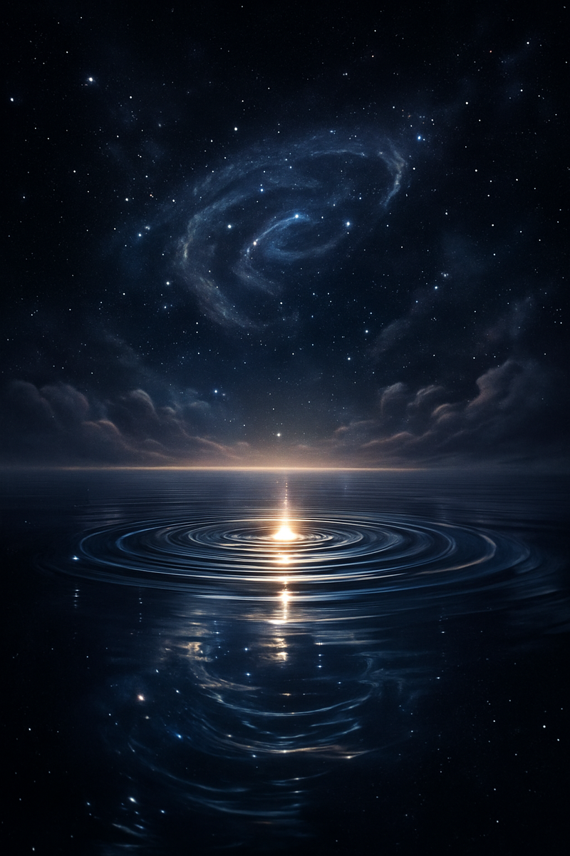 Где-то до всех дат и календарей мир был тихим. Не потому что «ничего не было», а потому что некому было назвать это «чем-то». Была тьма, которая не пугала. Было молчание, которое не требовало ответов. И был свет, ещё даже не рождённый, но уже готовый стать вопросом. Я наблюдал, как первым просыпается вода. Сначала это было просто движение: едва заметная дрожь, будто сама тьма вздохнула. Потом в этой дрожи появилась воля. Не разум, не план, а простое «хочу быть». *Мир не начинается со слова «да будет», Мир начинается с тихого «я есть».* Волна коснулась другой волны, и из их встречи родился первый узор. Так мир узнал, что можно не только существовать, но и отражаться. Свет появился не как вспышка, а как стыдливый намёк: в глубине воды загорилась точка, которая не умела быть тьмой. Она не грозила, не судила и не спасала. Просто показывала: вот здесь уже по-другому. *Свет не делит мир на «правильное» и «неправильное». Он всего лишь делает невозможным прежнюю слепоту.* С это