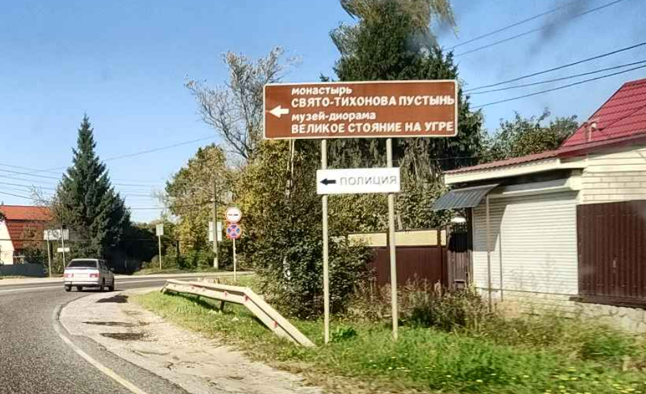 После довольно скромного Спасо-Преображенский Воротынского монастыря- женского- поехал в село Льва Толстого. В Тихонову пустынь. Калужская Свято-Тихонова пустынь — мужской монастырь Калужской епархии Русской православной церкви. Название села многих с толку сбивает. При мне две дамы пытались выяснить- а где здесь келья Льва Николаевича. Есть еще поселок «Лев Толстой». В Липецкой области. До 1918 – поселок Астапово. Там, на железнодорожной станции Астапово, в 1910 году и скончался писатель Л. Н. Толстой. А в Тихоновой пустыне Лев Николаевич никогда не был. До революции и село вокруг монастыря носило название Тихонова Слобода. Местный исполком совета рабочих, крестьянских и солдатских депутатов решил, что название слишком контрреволюционное. Вот и переименовали в село Льва Толстого. Почему? Якобы, председатель исполкома был большим поклонником таланта писателя. И даже, якобы, лично с ним встречался. В селе льва Толстого- большой указатель. Двести метров- и мы на парковке. У входа в обит