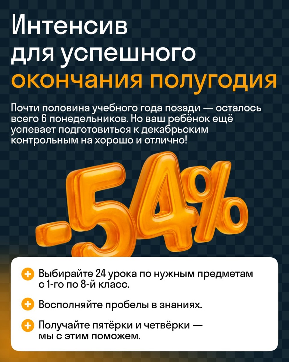 Интенсив для быстрого прогресса от Skysmart поможет вашему ребёнку заполнить пробелы в знаниях и окончить полугодие на пятёрки и четвёрки 😍 📎 Переходите по ссылке, чтобы получить скидку до 54%