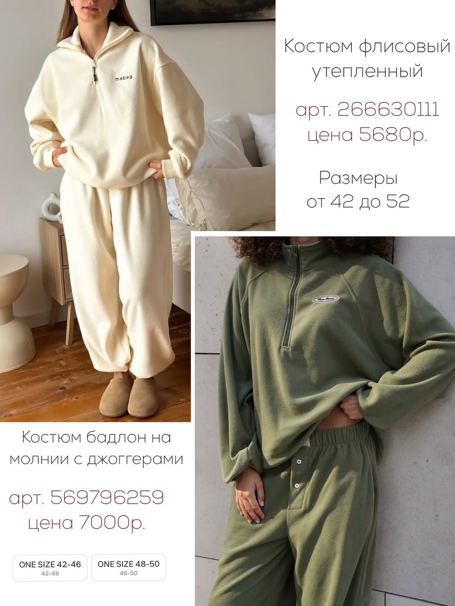 Здесь собраны флисовые костюмы, уютные рубашки, фактурные свитеры и актуальные широкие джинсы. Каждую вещь легко вписать в базовый гардероб и комбинировать между собой. Разберём всё строго по порядку, как на фото, с артикулами и подробными советами стилиста.