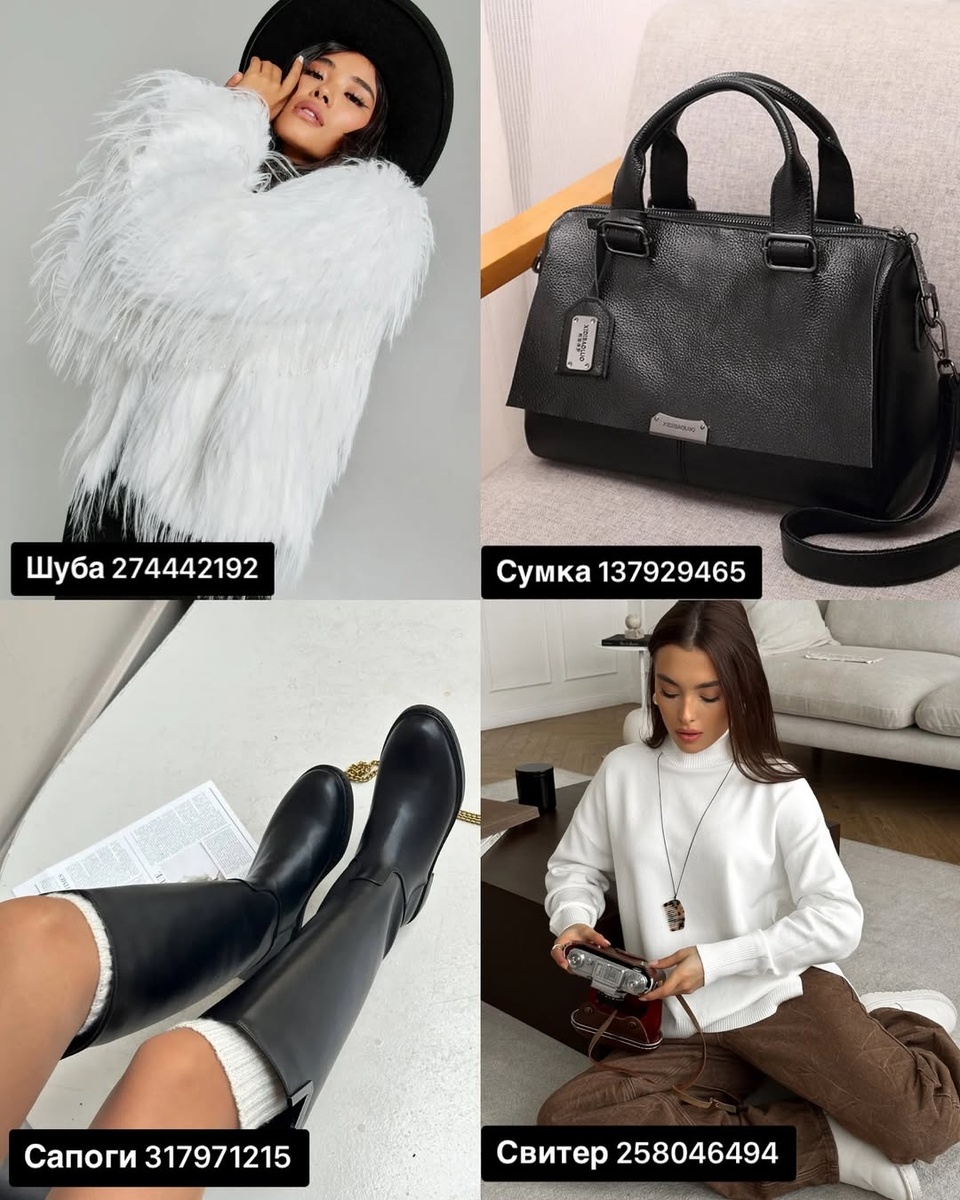 Комбинируя эти вещи, легко построить зимнюю капсулу: белый свитер можно носить и под тёмной шубой, чёрные сапоги — и с кардиганом, и с белой шубой, шоколадная сумка одинаково органична и в первом, и во втором блоке.