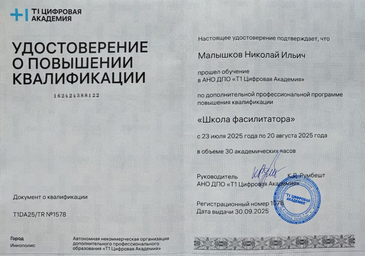 В подтверждение моей любви к обучению хочу похвастаться 🎓 — я прошёл курс «Школа фасилитаторов» от Т1Цифровая Академия! Что такое фасилитация, я узнал, наверное, всего года 4 назад. Но уже года два эта компетенция прочно закрепилась в моём ТОП-5 ключевых навыков менеджера. Если коротко, фасилитация — это организация и проведение групповой работы с помощью нейтрального посредника (фасилитатора), который помогает группе двигаться к общей цели: решать проблемы, генерировать идеи или принимать решения. Началось всё с книги Майкла Уилкинсона «Секреты фасилитации: SMART-руководство по работе с группами» — очень рекомендую тем, кто хочет прокачать командные обсуждения. Но быстро понял: без практики тут не обойтись. Поэтому, когда на работе открыли набор на курс, я сразу решил воспользоваться этой возможностью. Теоретическую часть, пожалуй, можно было закрыть книгой, но вот практика — была бесценна. Возможность попробовать себя в роли фасилитатора в «тепличных» условиях, обсудить реальные