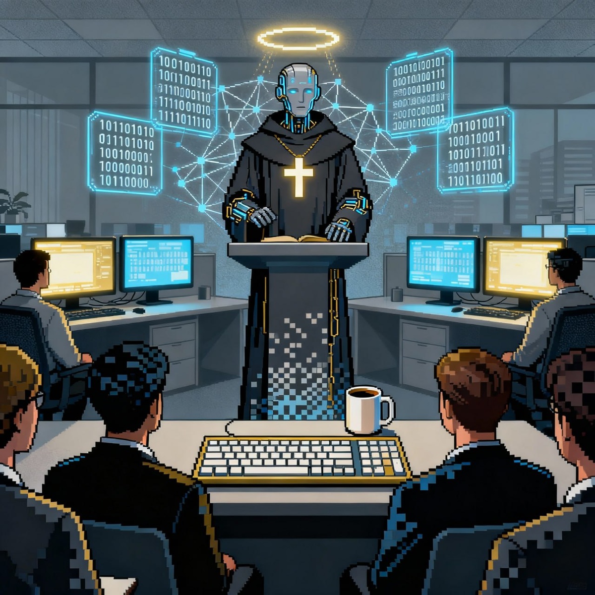 Священнослужитили корпораций Недавно с другом обсуждали идеальные и не очень процессы в корпорациях. В итоге пришли к выводу, что для идеального выполнения работ нужен политрук! Но если ввести политрука, то понадобится политрук для политрука... 😃 Значит, лучшее решение — отрешённый идеолог. Так родилась мысль об ИТ‑священнике. Он проповедует всё те же заповеди: 0. Я есть Команда твоя, источник идей, технологий и смысла труда твоего; не признавай других компаний выше духа своей. 1. Не создавай себе идола из методологии, технологии или фреймворка. 10. Не произноси имя Компании твоей напрасно — в пустых обещаниях, в гордыне или оправданиях; неславь её там, где не вложен труд и достоинство. 11. Помни день демо-презентации, чтобы свято его соблюдать. 100. Почитай наставников, тимлида, архитектора и менеджера; и наставляй младших, чтобы преемственность не прервалась. 101. Не разрушай чью-то работу — ни из злости, ни ради власти; созидай, а не уничтожай. Код-ревью не пропускай. 110.