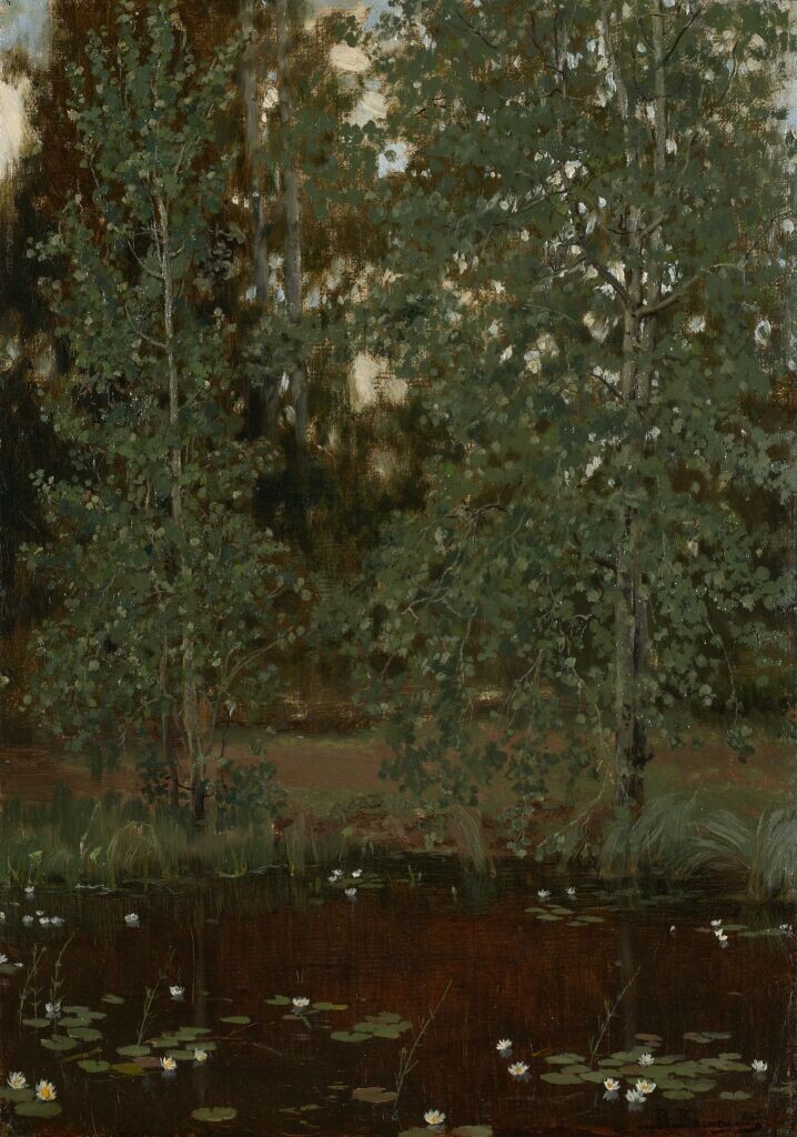 Безмолвная неподвижность Нефритового пруда. Вчера ожившая вишня Сегодня уже седа. То, что едва успело Родиться и расцвести, Ляжет под ноги белым Безжизненным конфетти. Только в зеркале вечной Нефритовой глубины Отблеск мелькнет как вестник Следующей весны. В. М. Васнецов «ПРУД В АХТЫРКЕ». 1880 г. Государственная Третьяковская Галерея