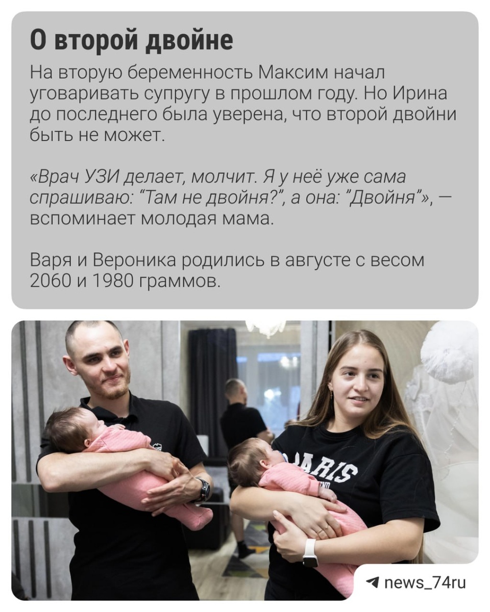 В семье из Копейска родились две пары близнецов подряд: вот их история Двойняшкам Ване и Вике четыре года, младшим Варе и Веронике — два месяца. При виде гостей сестра-двойняшка Вани крутится вокруг мамы и немного смущается незнакомых людей. А как только оставшаяся в комнате самая младшая сестренка подает голос, тут же бежит к кроватке — проверить, все ли в порядке. Сам Ваня забирает все внимание гостей на себя, осыпая корреспондентов @74.ru вопросами. 🟥 Такая семья была папиной мечтой. Многодетная мама Ирина признается: никогда не думала, что у нее будут двойняшки, хоть сама из двойни. Максим с детства хотел большую семью: «У меня никого не было — ни братьев, ни сестры. Вообще один. Даже двоюродных нет, только дядька был на четыре года постарше. И я всегда мечтал, чтобы у меня семья большая была. Вот, получается все потихонечку». 🟥 Первая двойня. О том, что в семье появятся сразу два малыша, первый раз молодые родители узнали на десятой неделе беременности. Но беременность прошл