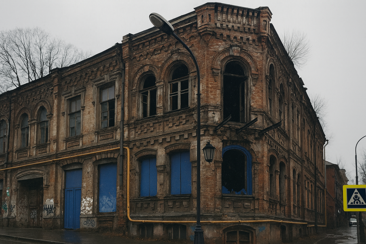 Вот стоит шикарный исторический дом, который в любом европейском городе был бы украшением квартала. А под ним — облезлая вывеска в стиле «донской ломбард 2001 года» и асфальт, похожий на сломанные плитки пазла.