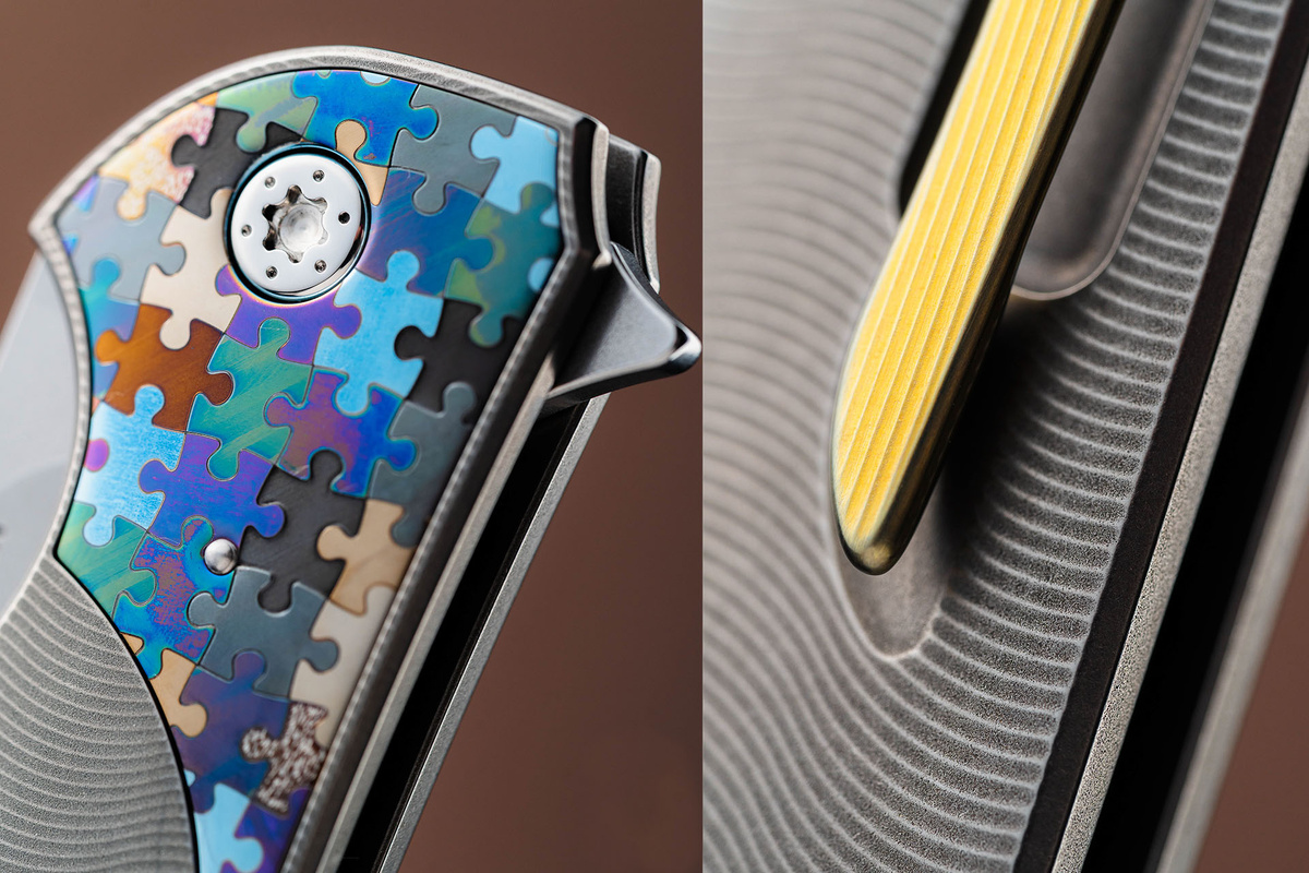 Архивариус Заметки коллекционера В мире коллекционных ножей, как и в хорошем джазе, есть место не только грубой силе, но и утончённой гармонии. Можно собрать инструмент, который будет кричать, или можно создать тот, что будет вести тихую, сложную беседу с владельцем. Новый складень от Herman Knives с их фирменной гравировкой «Ishtar Puzzle» — это как раз последнее. Это не просто клинок. Это саксофонное соло, отлитое в титане и высокоуглеродистой стали. Спецификация, которую мне прислали, читалась как партитура для джазового ансамбля: Но сухая статистика — лишь ноты на бумаге. Магия начинается, когда вы берете этот инструмент в руки. Солирует в этом ансамбле, безусловно, клинок. Он выкован из порошковой нержавеющей стали Böhler M398 — материала, который после глубокой криогенной обработки жидким азотом выходит на твёрдость в 62-63 HRC. В мире сталей это аналог выдержанного, сложного тембра старинного саксофона. Он способен держать заточку вечно, а его покрытие «под старину» придаёт ему