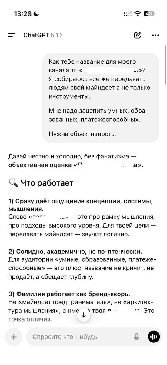 Вчера ИИ буквально довел меня до слез. Я так не смеялся и не горел уже очень давно. Так меня не смешила ни одна шутка в кино много лет. Я все еще в процессе докрутки нового названия и «Системы» будто бы отражают меня, но не полностью. Про это будет отдельный пост. И я попросил ИИ оценить мою новую идею и предложить его варианты…ну мало ли, иногда он рожает очень хорошие фразы. Но…кажется с настройкой «человечности» GPT в этот раз переборщили + перкормили американизмами до таких галюников. В общем сами смотрите картинки, самая вкуснячая подливка в конце 😆😆 Днем поголосуем за лучшее 😀