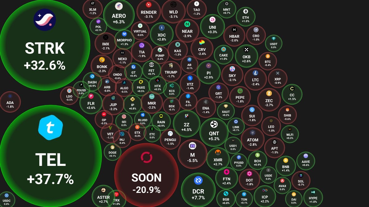 📊 Ежедневный обзор рынка криптовалют от Coinbubbles.ru 🗓 16.11.2025 09:31 по Москве. 🔗 Посмотреть на сайте 📈 Лидеры роста (из ТОП-100): 🟢 Telcoin (TEL): $0.0070 (+37.7%) 🟢 Starknet (STRK): $0.2266 (+32.6%) 🟢 Decred (DCR): $36.27 (+7.7%) 📉 Лидеры падения (из ТОП-100): 🔴 SOON (SOON): $2.0860 (-20.9%) 🔴 MemeCore (M): $2.1871 (-5.5%) 🔴 Worldcoin (WLD): $0.6982 (-3.1%) 🔍 Основные метрики: 🔴 Общая капитализация: $3261.87 млрд (-0.19%) 🔴 Общий объем торгов: $111.96 млрд (-47.75%) 🔴 Доминация Bitcoin: 58.66% (-0.16%) 🟢 Доминация Ethereum: 11.87% (+0.13%) ⚪️ Индекс страха и жадности: 10 / 100: ЭКСТРЕМАЛЬНЫЙ СТРАХ (0) 🔴 Индекс Альтсезона: 32 / 100: НЕ АЛЬТКОИН-СЕЗОН (-1) 📖 Интересные статьи: 👉 Популярные виды мошенничества в крипто Телеграм чатах. 👉 Сравнение биржевых токенов: преимущества владения GateToken (GT). 😻 Наши сервисы и бонусы: 💰 Cryptoage.com - рассказываем про Блокчейн и Криптовалюты с 2013 года 📈 edgeX - ТОП-4 DEX биржа, пассивный доход до 70% годовых!!!