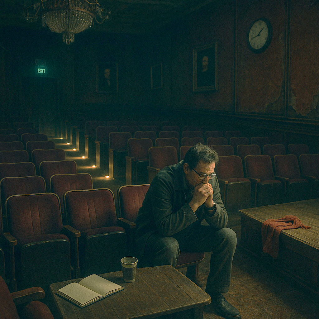 Актеры расходились медленно, с облегчением. Он остался в зале один. Тишина была густой, почти материальной. Где-то скрипнула дверь, где-то далеко, за стенами театра, проехала машина. Тиканье настенных часов в фойе доносилось сюда, в зал, ритмичное и равнодушное.