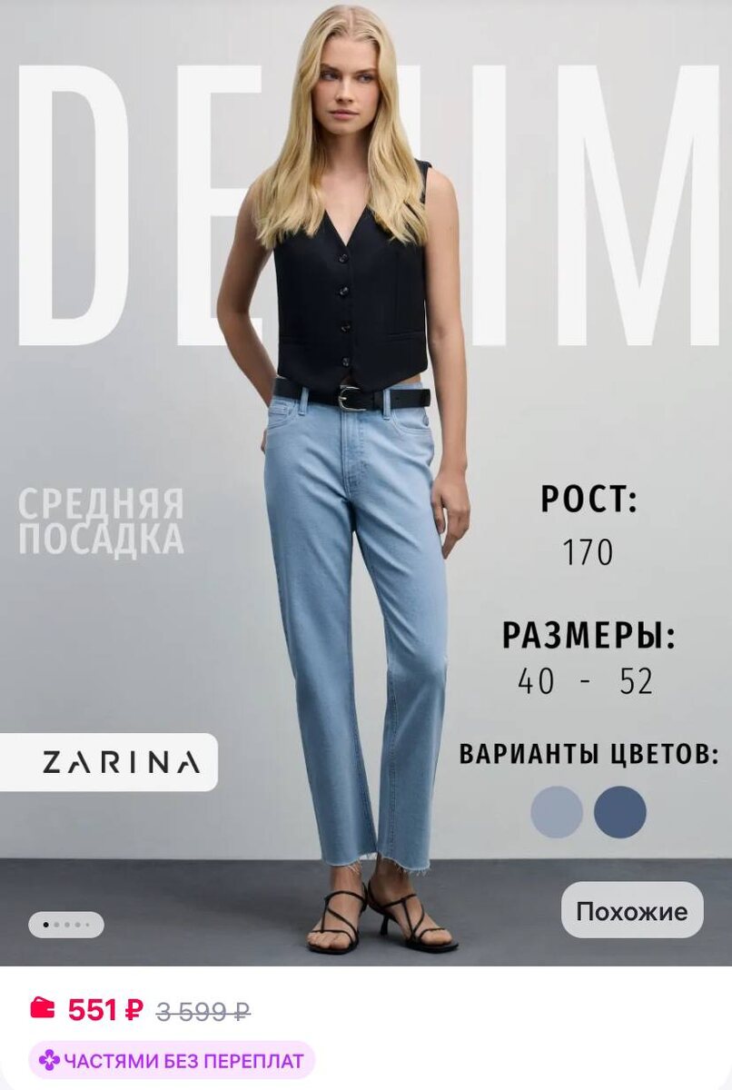 ZARINA Джинсы скинни облегающие зауженные со средней посадкой https://www.wildberries.ru/catalog/237964174/detail.aspx 551 ₽ ТВОЕ Прямые джинсы с декоративной петлей сбоку https://www.wildberries.ru/catalog/186285732/detail.aspx 525 ₽ LC Waikiki Джинсы https://www.wildberries.ru/catalog/264655161/detail.aspx?size=410790198 735 ₽ ✅ Подписаться 🔣 Бот с промокодами