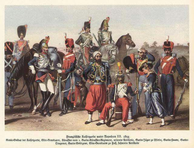 1 Мая 1854 г императором был издан указ о создании Императорской Гвардии. К Июлю были сформированы : Почётная Гвардия, 2 полка гренадёров, 2 полка вольтижёров, батальон пеших егерей, кирасирский полк, полк гидов, полк пеших жандармов, полк конной артиллерии и инженерная рота.