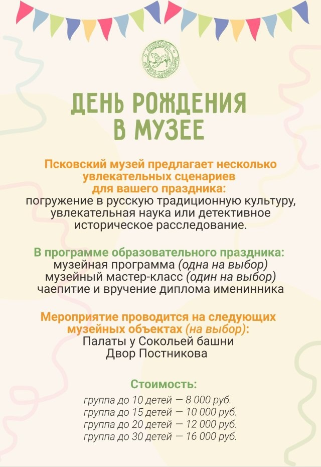 Вы знали, что детский день рождения можно провести в музее? 🎈 🎉 Псковский музей-заповедник предлагает несколько увлекательных сценариев для детского праздника: погружение в богатую традиционную культуру России, увлекательные «раскопки» и интригующее расследование, полное тайн. 📲 Подробности по телефонам: +7 811 233-13-90 (доб. 1), +7 811 229-22-59 или +7 911 358-08-16. Оставайтесь с нами #НашаПсковскаяобласть