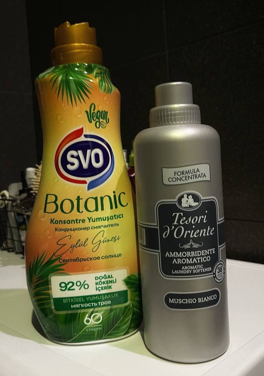 Моя рекомендация кондиционеров для белья ❤️🔥 Очень люблю воскресенье за то, что можно переделать много дел 💪🏻 Очень люблю все перестирывать и очень люблю чистоту ☝🏼 Рекомендую присмотреться к кондиционеру для белья бренда SVO distribution (турция), у них большие объемы и отличная цена. У кондиционера для белья «сентябрьское солнце» очень нежный запах, в основном я использую его. Второй кондиционер у меня итальянского бренда TESORI d’Oriente - его я использую для стирки постельного белья и полотенец, запах чистоты + люкс💎🥰 #находкидлядома@volosy_v_fokuse