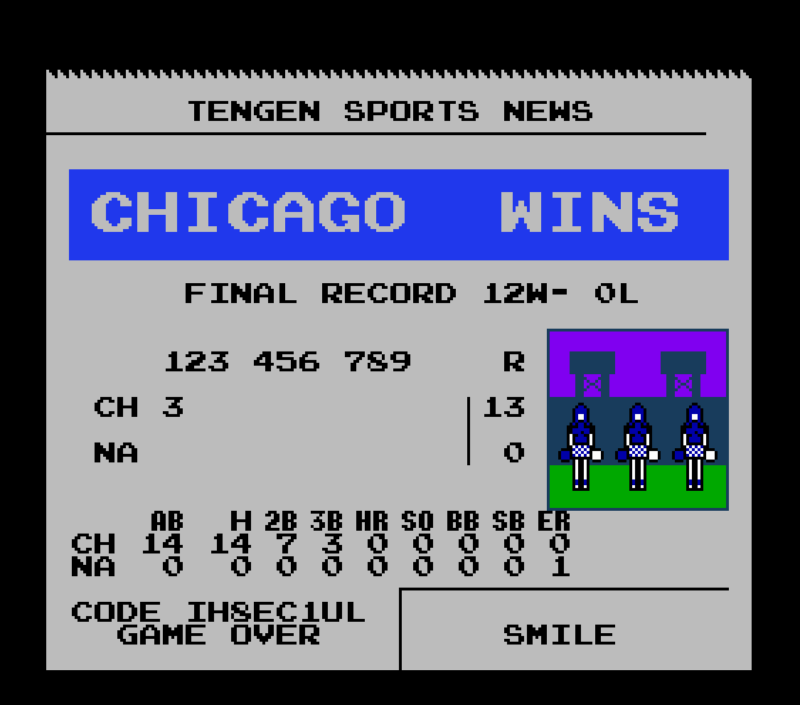 «R.B.I. Baseball 2» – Прошёл игру на лёгком уровне за американскую команду. Теперь усложняюсь и перехожу в национальную лигу. Здесь 12 встреч, которые я успешно, но не без помощи магии эмулятора, прошёл. А вот так выглядит режим просмотра.