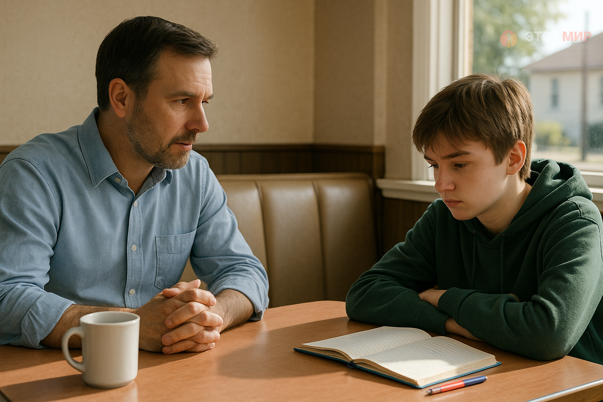 Андрей сел, поставил кружку кофе, представился. Разговор шёл вяло, но через два дня он вернулся. Потом снова. Через неделю общение стало привычкой. Они говорили о школе, спорте, ерунде. И Матвей, как закрытая книга, начал понемногу раскрываться. Впервые за долгие годы он встретил человека, который смотрел на него без страха.