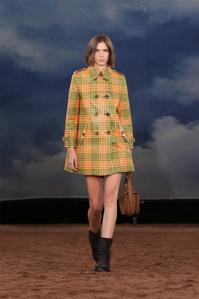 Короткие тренчи были выполнены из вощёного хлопка с эффектом денима, что радикально изменило их вид: от кремовой строгости габардина к более рок-н-ролльному, контркультурному стилю. Ноток инаковости добавила западная линия дугообразного нагрудного ремня. Были представлены и А-силуэтные версии архетипа Burberry, более короткие и покрытые не совсем психоделическими клетками, напоминающими тренч в стиле Мэри Куант.