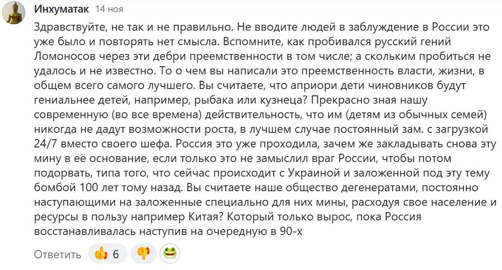 Здравствуйте Начну с того, что в интернете попался мне на глаза, похоже заказной, материал по теме преемственности власти детьми сегодняшних чиновников и возрождение тем самым Империи. Заголовки были типа -"В Кремле возрождают тайный проект", или "Дети Путина, Медведева, Патрушева заставляют задуматься: Будущее России — Империя" и тд. Почему я решил, что публикация эта заказная, да потому, что несколько дней публиковался один и тот же смысловой текст, но с разными обложками. Я сделал как-то на одном ресурсе коммент., о том, что я об этом думаю, см. ниже: Но вот привлекла меня в следующей подобной публикации обложка (картинка) перед ней, напомнив мне тему, которую я иногда обдумываю, см. ниже, а именно наш Герб, вернее его смысловая нагрузка. Хотя публикация с этой картинкой была посвящена другой теме (говорил о ней в начале), я высказал свои мысли по теме, которая интересовала меня. Предлагаю ознакомиться с тем, что из этого получилось, см. ниже, для меня комменты оказались "говорящим