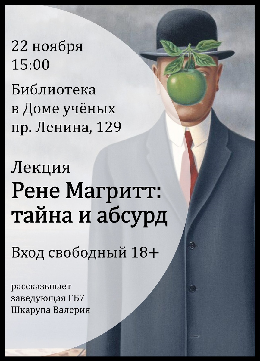 🗣22 ноября в 15:00 в библиотеке №7 в Доме учёных пройдёт лекция «Рене Магритт: тайна и абсурд