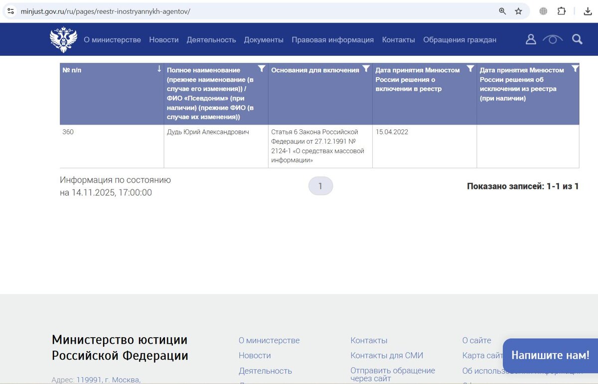 Прокурор на заседании суда заявил, что блогер Юрий Дудь* (признан в РФ иноагентом) не указывал в публикациях пометку о включении его в реестр иностранных агентов из-за несогласия с политикой РФ и неприязни к Вооруженным силам страны, передает корреспондент «РИА Новости». «Дудь*, будучи несогласным на протяжении длительного времени с основными направлениями внутренней и внешней политики Российской Федерации, в том числе в области обороны, испытывая в связи с этим неприязнь к деятельности президента РФ и Вооруженных сил… действуя умышленно, допустил распространение материалов в интернет-мессенджере без указания на то, что они произведены и распространены иностранным агентом или касаются его деятельности», – сказал прокурор. На уходящей неделе Дудь* был заочно приговорен к 1 году и 11 месяцам колонии общего режима: такое наказание запрашивала сторона гособвинения. Адвокат Дудя*, согласившись, что «формально в действиях есть состав преступления», тем не менее настаивал на прекращении дела
