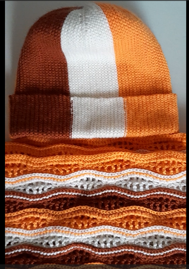 Мой трехцветный комплект: шапочка + шарф готов.