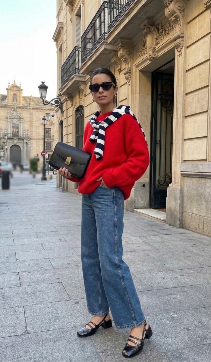 Главная ловушка — выбор модели по трендам, а не по геометрии тела. Слишком узкие скинни обтягивают и подчеркивают то, что хочется скрыть. В 2026 году актуальны модели с мягкой линией бедер и прямыми штанинами. Они выглядят расслабленно, но сохраняют благородство формы. Красный мохеровый свитер поверх полосатого джемпера с широкими синими джинсами и черной сумкой создают выразительный контраст.