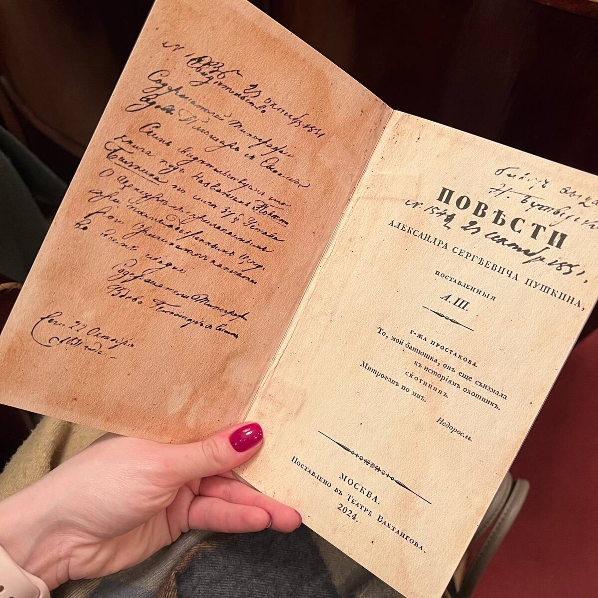 Говорят, москвичи чаще бывают в театрах Петербурга, чем петербуржцы в театрах Москвы. Не знаю, так ли на самом деле, но я, приезжая в столицу, всегда стараюсь найти время для хорошего спектакля. Вот и недавно посмотрела в театре Вахтангова «Повести Пушкина». Спектакль идёт на основной сцене, что находится на Старом Арбате. Знаю, что эта улица пользуется у гостей столицы особой популярностью, но, признаюсь, не понимаю, почему. А вот историческое здание Вахтанговского театра кажется мне интересным и снаружи, и внутри. Спектакль «Повести Пушкина» поставил главный режиссёр Анатолий Шульев на основе историй, написанных Александром Сергеевичем Болдинской осенью от лица вымышленного персонажа – Ивана Петровича Белкина. (Премьера состоялась весной 2024 года). В первом акте зрители встречаются с героями «Барышни-крестьянки» и «Выстрела», во втором акте – с героями «Метели» и «Станционного смотрителя». Сквозной персонаж – человек, путешествующий по городам и весям, ставшим свидетелем неординар