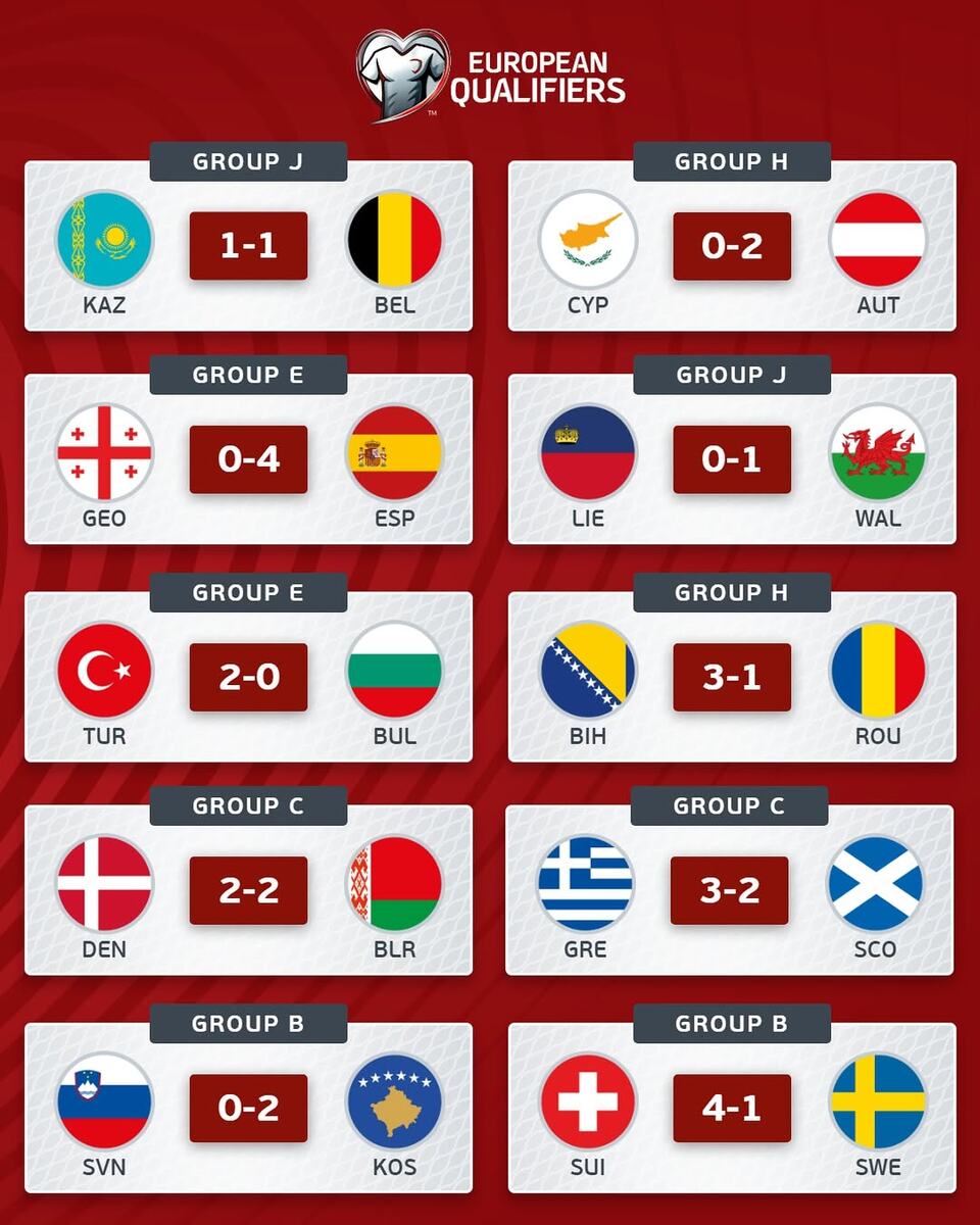 Чемпионат мира - 2026 – квалификация (Европа, 5-й игровой день) Группа В Косовары по делу и уверенно обыгрывают Словению, мотивация которой давно угасла ввиду ситуации в таблице. Косово даже в случае победы в последнем туре не попадет на первое место, так как надо победить с разницей в 10 и более голов. Грэм Поттер в дебютной игре у руля сборной Швеции отметился тем, что распечатал ворота непробиваемого Грегора Кобеля. Швейцарцы разгромили шведов и уверенно лидируют в группе. Группа С Обоюдоострая игра в Пирее. Шотландцы не пользуются осечкой Дании оставаясь на второй строчке таблицы. Греки расслабились после третьего гола и едва не выпустили победу. Подопечные Стива Кларка в большинстве не смогли вырвать хотя бы ничью. Беларусы ошарашили Данию, набирают свое первое очко в этом отборе и делают последний тур решающим в группе. Группа Е «Красная Фурия» легко делает результат в Тбилиси. У Грузии не было ни единого шанса. Турция берет свое в игре с Болгарией. Чтобы на прямую выйти на ЧМ