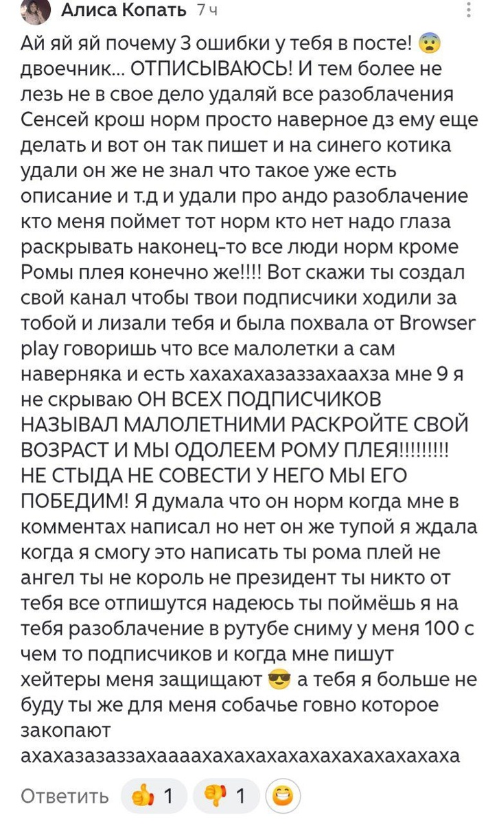 Всем привет, не очень конечно хочется кормить аудиторию разоблачениями, но поугарать надо😁. Сегодня у нас на разборе ещё одно разоблачение малолетки. Скрин в студию: 1) "Ай ай ай три ошибки в посте😨" Так ещё и двоечник говорит хейтер. То есть она говорит, что у меня три ошибки и так в огромном посте, хотя у неё самой грамматических и смысловых ошибок больше, чем у всех моих статей вместе взятых💀. Меня бесит логика хейтеров, у которых один аргумент это "писать научись, двоечник" Хотя сами допускают ошибки. А когда я прошу привести доказательства про мои ошибки, они молчат. А почему? Потому что они этот аргумент из воздуха придумывают и не могут потом доказать. Итог тупой высер! 2) "Не лезь не в своё дело и удаляй все разоблачения". Она серьезно думает что после её высера я побегу удалять свои разоблачения? Хахаххахах. И где я лезу не в своё дело? Пока похоже, что ты лезешь не туда куда надо💀 3) Далее она начинает комментировать мои разоблачения, подробнее цитирую слова "Сенсей кро