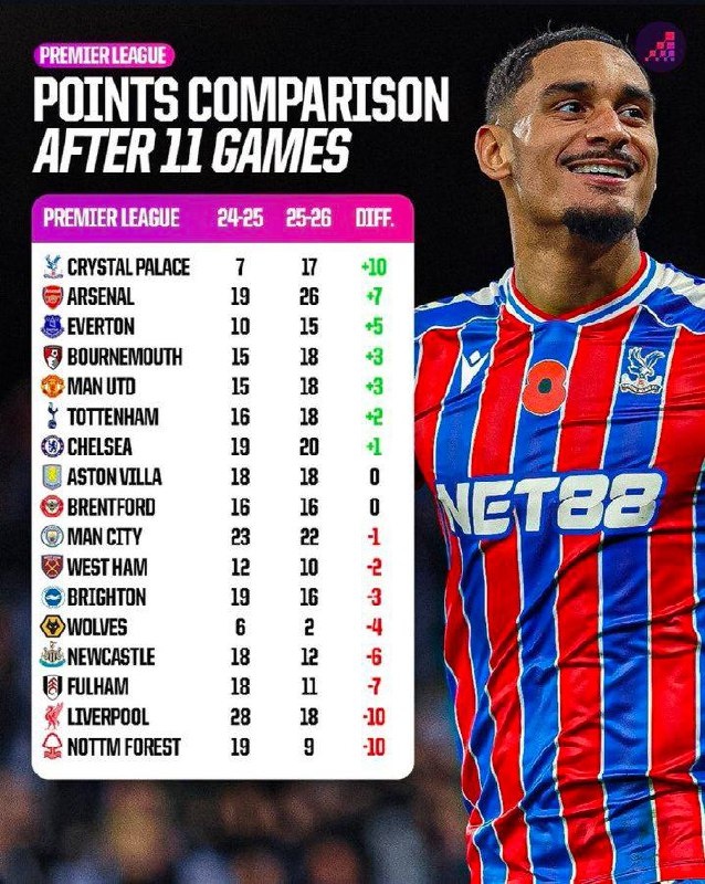 После 11 туров у "Кристал Пэлас" на 10 очков больше, чем на данной стадии прошлого сезона Премьер-Лиги, и это рекорд среди всех команд 📊