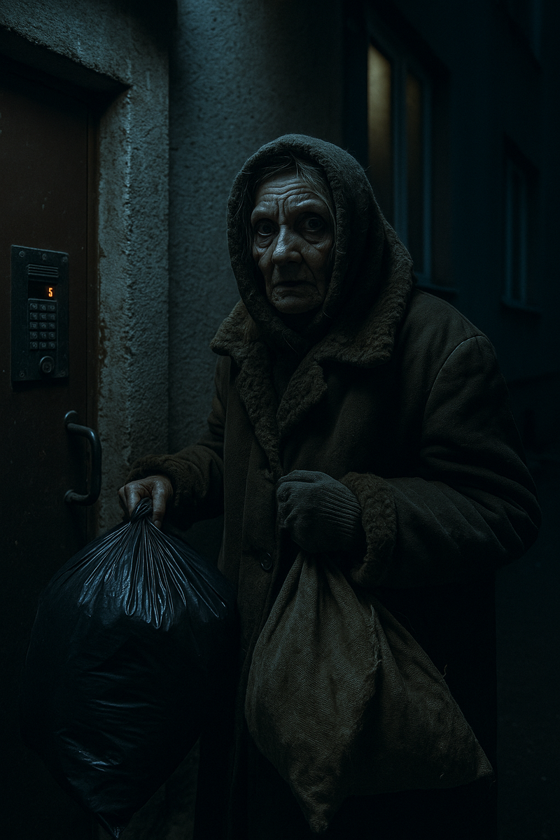 Она сидела на перевёрнутой пластиковой коробке, как на табуретке. На ней был старый тулуп, весь в катышках и пятнах, будто им по очереди вытирали полы. Сверху — платок, завязанный «по-стариковски», под подбородком. Рядом — тележка с ржавыми колёсами и два огромных мешка, набитых до хруста: из одного торчал рукав мужского пальто, из другого — детская куртка с облезлыми звёздочками.