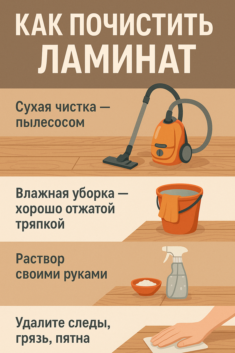 Рассказываю, как правильно чистить ламинат, чтобы он всегда выглядел как новый. 🔹 1. Начните с сухой уборки Это важный шаг — грязь и песок оставляют микротрещины. Лучше всего подходят: пылесос с мягкой щёткой сухая микрофибра мягкая метла Проводите сухую уборку 2–3 раза в неделю. 🔹 2. Правильный состав для влажной уборки Ламинат не любит много воды.