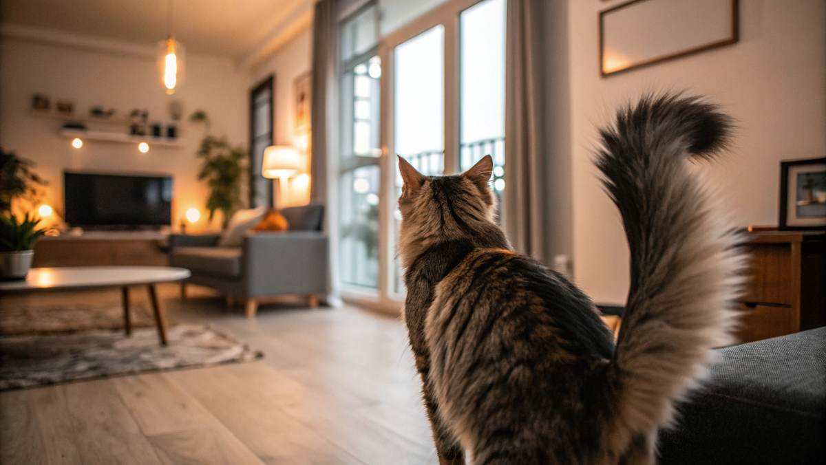 Кошка сидит спиной к вам, мордой к комнате. Она не игнорирует вас. Она охраняет. Вы за её спиной — безопасность гарантирована, можно не следить. Комната перед ней — неизвестность, нужно контролировать. Окна, двери, звуки, движения. Кошка берёт на себя роль наблюдателя.