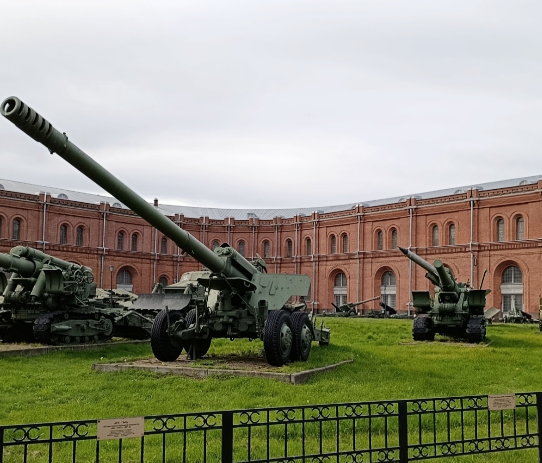С утра встали, позавтракали чем Бог послал, и поехали в Артиллерийский музей - муж давно хотел попасть в него. Причём один раз мы уже почти там были, но зависли на обширной экспозиции старинных пушек и современных орудий. Эта экспозиция расположена во внутреннем дворе музея. На площади более двух гектаров, на открытых площадках размещено около 250 единиц артиллерийских орудий, ракетного вооружения и инженерной техники