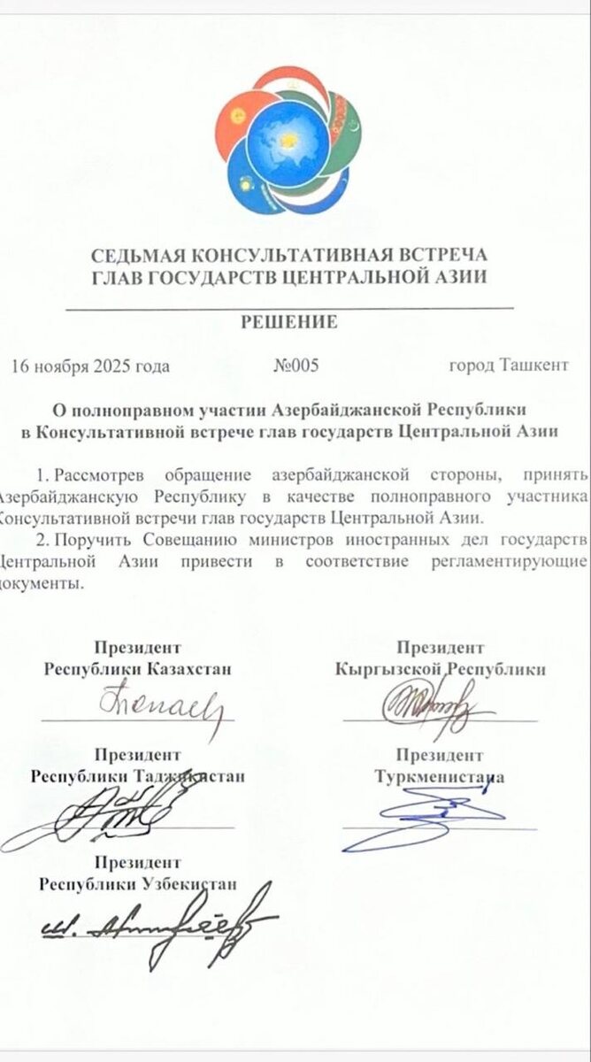 В ответ на пост 🇺🇿🇰🇿🇰🇬🇹🇯🇹🇲 Markaziy Osiyo davlat rahbarlari quyidagi muhim hujjatlarni ham qabul qildi: 🔹Ozarbayjonning Markaziy Osiyo davlatlari rahbarlarining Maslahat uchrashuvida to‘la huquqli a’zo sifatida ishtirok etishi to‘g‘risidagi qaror; 🔹Qirg‘izistonning 2027—2028-yillarda BMT Xavfsizlik Kengashining muvaqqat a’zoligiga nomzodi yuzasidan BMTga a’zo davlatlarga murojaat; 🔹Markaziy Osiyoda mintaqaviy xavfsizlik va barqarorlik konsepsiyasi; 🔹Markaziy Osiyo xavfsizligiga xatarlarning katalogi va ularning oldini olish bo‘yicha 2026-2028-yillarga mo‘ljallangan choralar. @daryolive