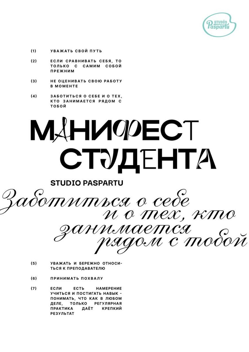 Педагогические принципы и ценности нашей студии мы изложили в Манифесте студента Studio Paspartu