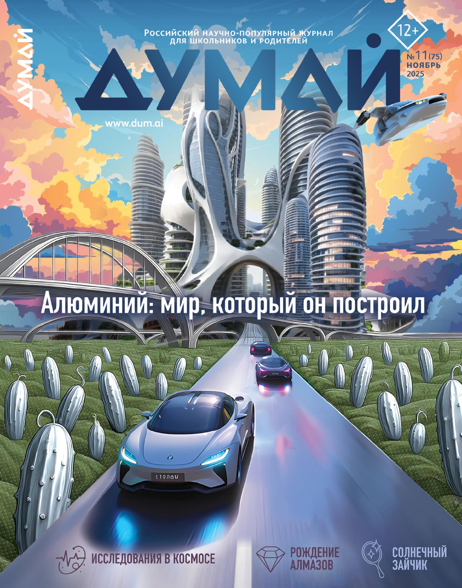 🍂 Ноябрь в разгаре! Самое время для новых открытий — встречай свежий ноябрьский выпуск «ДУМАЙ»! «ДУМАЙ» (12+) — это научно-популярные журналы, которые объединяют всю семью. Тысячи читателей по России уже убедились: с нами учиться — это увлекательно! 🚀 В этом номере тебя ждёт: ⚗️ Без алюминия: Каким был бы мир без этого универсального металла? 🔢 Это база: Ищем простые числа и разгадываем математические загадки 💧 Загрязнение недопустимо: Как очищают воду и спасают планету ✨ Фотоны в бегах: Откуда берутся солнечные зайчики и как они работают 🎨 Химия пигментов: Почему краска выгорает на солнце и как это остановить 🌵 Планета-пустыня: Может ли на Земле исчезнуть вода и что нас ждет 🌱 Лаборатория жизни: Все о клонировании растений и современных технологиях 🧬 Аравидопсис: Сорняк, который изменил науку и наши представления о биологии 💎 Драгоценный минерал: Зачем нужны алмазы и где они применяются 🏥 Лечение кислородом: Полезная терапия или бесполезная трата времени? 🌌 Наука на МКС: К