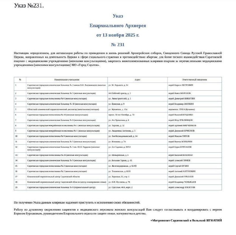 Священники начнут работать в женских консультациях и роддомах Саратова. В каждой больнице города появится «ответственный священник», который будет отговаривать женщин от абортов. Указ уже подписан, но в документе не уточняется, как точно будет организована работа священников. Сами больницы информацию пока не подтверждали