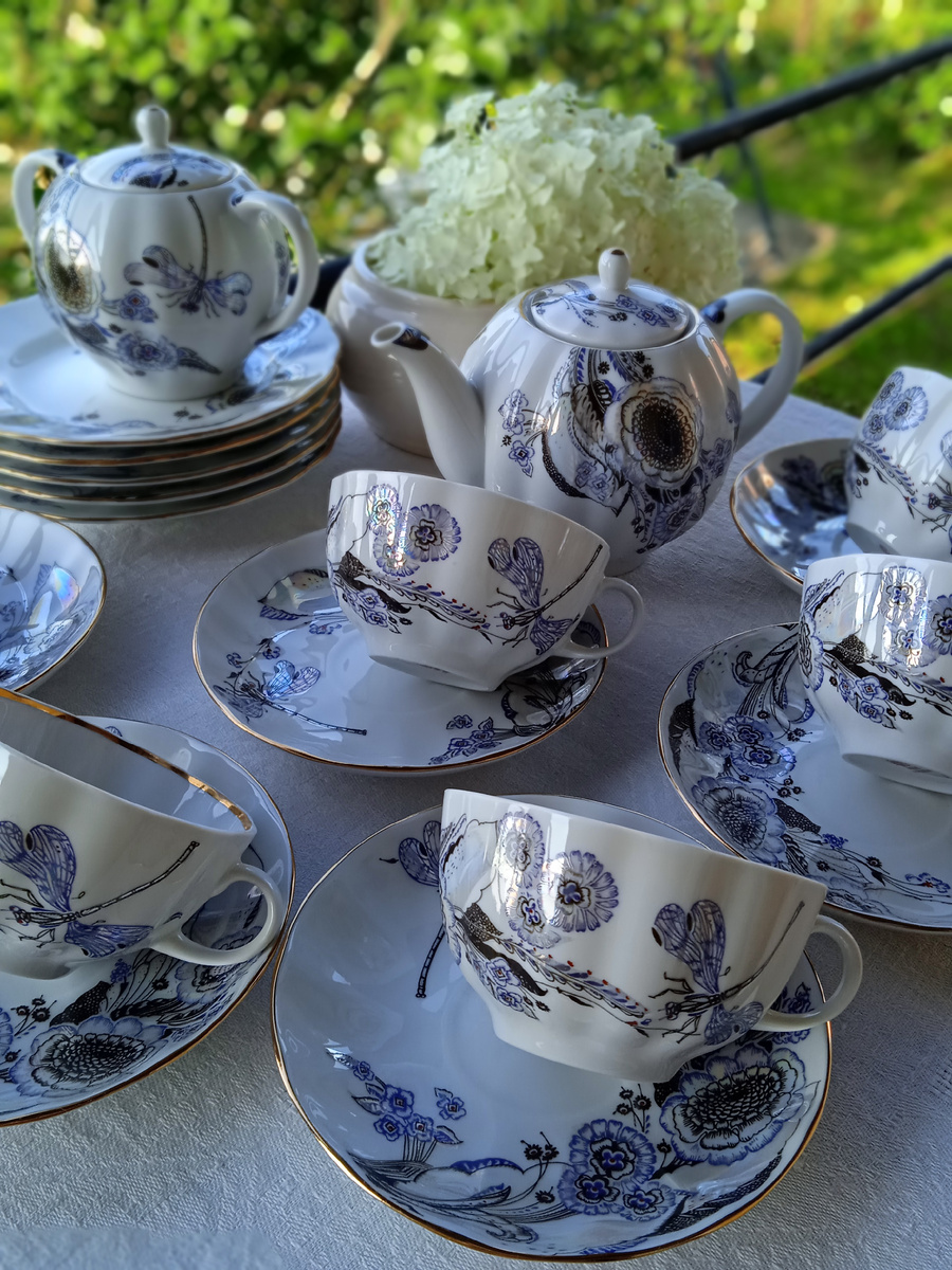 Просто водоворот фарфора в моём доме😊. Что-то уезжает, Что-то приезжает. Очень увлекательно и интересно. Ещё ни чем в своей жизни так не увлекалась, как этим водоворотом😊. В прошлом месяце случилась большая продажа части сервиза ЛФЗ. Предметы ЛФЗ в основном у меня дорогие и продаются не так активно, как другие. И такая большая продажа неожиданно произошла. Я покупаю неполные сервизы и продаю попредметно. Этот сервиз заслуживает целого рассказа и показа, потому что он просто необыкновенно красивый: Чайный сервиз ЛФЗ Шёпот стрекоз. Завораживающий рисунок и название сервиза. Летящая стрекоза - визитная карточка автора рисунка Н. Павловой. Хочется смотреть и смотреть на этот сказочный мир цветочных фей. Форма тюльпан С. Яковлевой. Красное экспортное клеймо. Неповторимый, редкий и в состоянии нового без каких-либо либо следов использования. Сервиз я купила за 5 тысяч рублей с небольшим. У меня купили шесть чайных троек вместе за 16000 рублей. За вычетом 9% Авито я получила около 1450