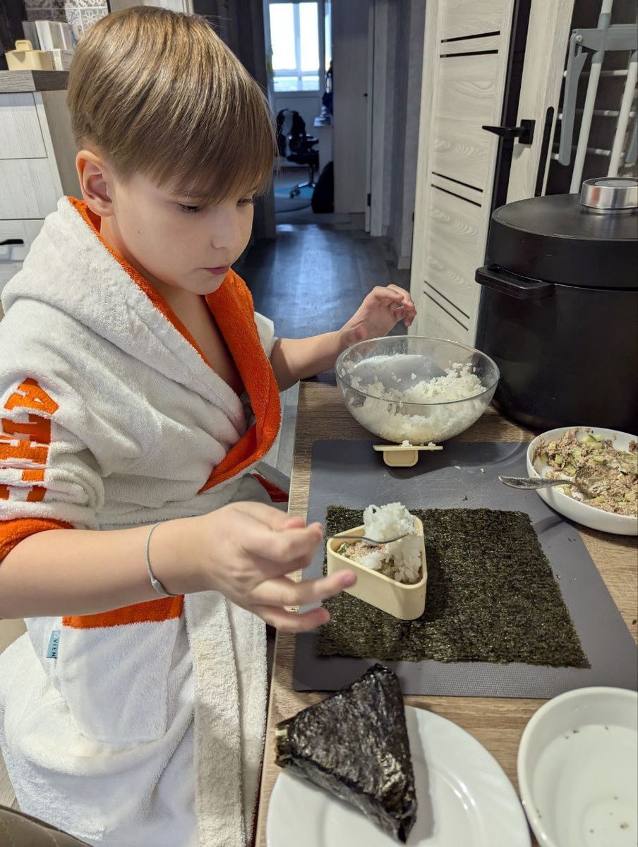 Задание дня - Онигири. Ну не совсем так, конечно, была поставлена задача, но все же. Рассказываю. Участвую я в одном чудесном марафоне, где на сегодня было "задание дня" сделать что-то, чего раньше никогда не делала. А несколькими днями ранее, коллега с работы попросила напечатать на 3D принтере форму для изготовления онигири. Короче, захотела я и себе такие же. Как говорится, захотела-получила, вот сейчас сиди и мучайся. Детей побила на помощь в приготовлении. Сбегала за продуктами и осознала, что на эти деньги можно было минимум дважды заказать суши. И вообще, занятие себе можно было и подешевле выбрать. Но отступать уже поздно. Сегодня наш главный "поварёнок" с температурой, поэтому мне помогает и дегустирует младшенький. А его, как выяснилось, вообще опасно на это подпрягать, потому что дегустирует больше чем делает. Как итог, онигири готовы, процесс не сложный, весьма увлекательный. Семья сытая, задание выполнено, карточка пустая. 🤦🏻♀️
