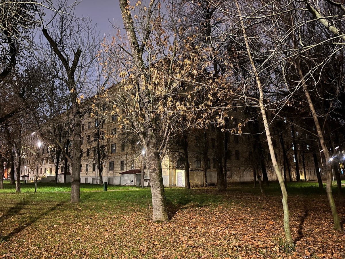 Жилой дом Пятиэтажное здание 1934 года постройки с установленной мемориальной табличкой Хотимскому Михаилу Васильевичу поздним вечером Адрес: 1-й Краснокурсантский проезд, 1/5 Источник: архив lefortovo_today