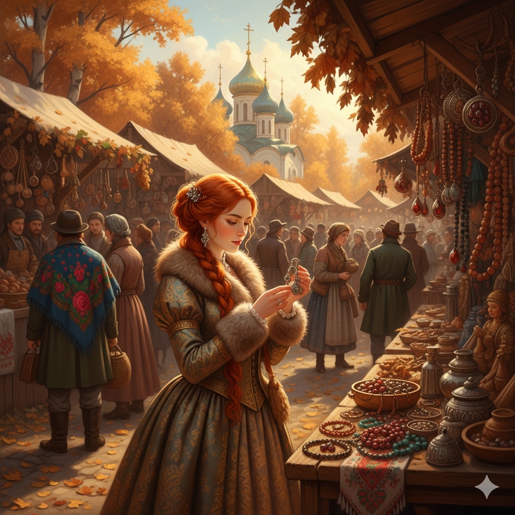 В этом рассказе я попыталась показать живой срез повседневности, за которой скрывается надвигающаяся опасность. Елена очень ждала начала осенней ярмарки. Она выбегала из дома градоначальника и прогуливалась возле забора из кованного железа, разглядывая приготовления на главной площади. Рабочие сколачивали деревянные лотки и небольшой помост. Торговцы из разных уголков губернии выкладывали свой товар. Наконец, наступило утро, когда ярмарка официально открылась и семья Лазаревых покинула осенний сад своего пристанища и вступила в буйство красок, запахов и звуков. Иларион вызвался сопровождать Елену, и они быстро затерялись в толпе. Матушке необходимо было оценить урожай, как единственной (пусть и временной) хозяйке дома. Елене же было не интересно смотреть на