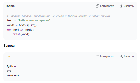 Объяснение: Цикл for проходит по каждому слову как по ступенькам лестницы.