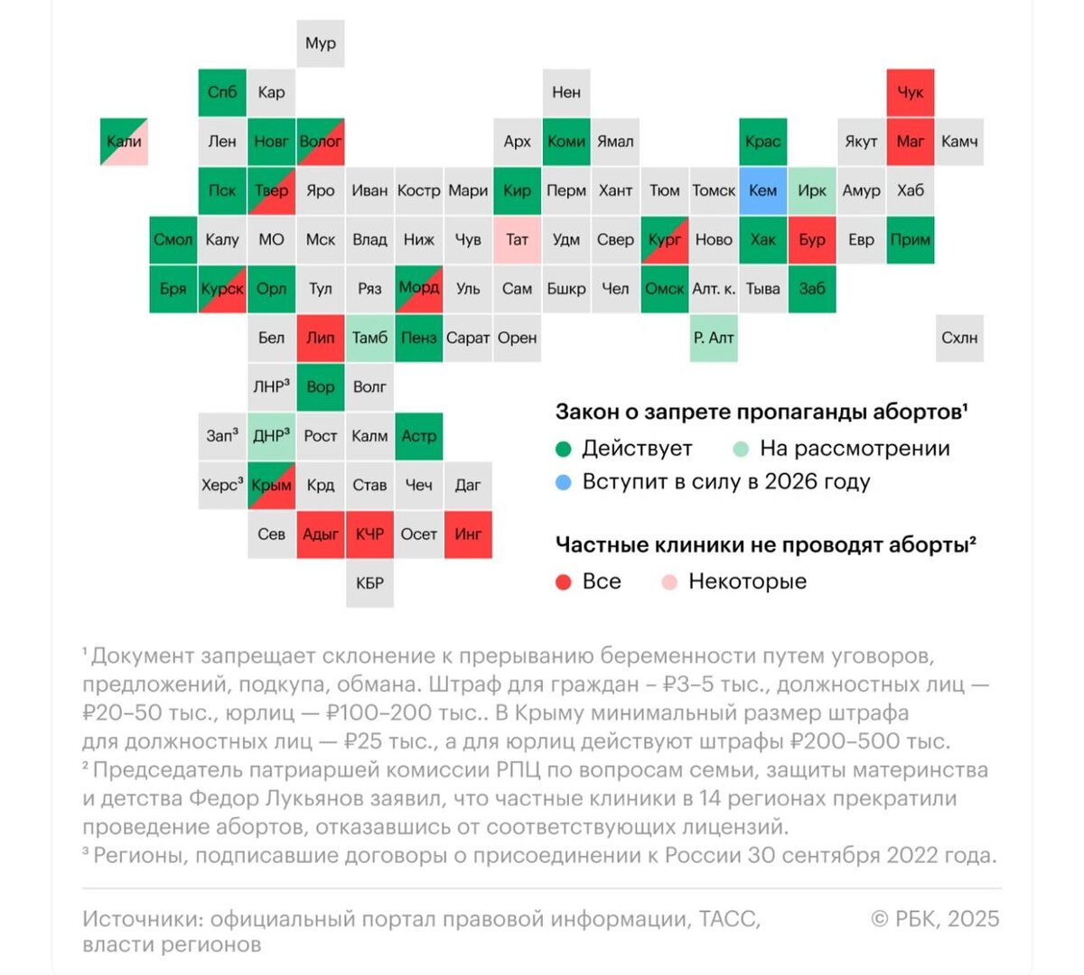 🤰 Более 30 регионов ввели ограничения на аборты. На федеральном уровне подобный запрет предлагали ещё в 2023 году, но законопроект так и не приняли и позже предложили отозвать. Тем временем регионы продолжают ужесточать правила самостоятельно: к ноябрю 2025 года в 14 субъектах частные клиники добровольно сдали лицензии на проведение абортов, а штрафы за «склонение к прерыванию беременности» действуют уже в 23 регионах. В Кузбассе закон вступит в силу в 2026-м, ещё пять субъектов его рассматривают. Максимальные штрафы — до 500 тысяч рублей — действуют в Крыму. Церковь и часть региональных властей считают ограничения необходимыми для «поддержки демографии», власти же федерального уровня обсуждают либо ужесточение доступа к препаратам, либо расширение помощи семьям. ПОДПИШИСЬ 🔴 ПРЕДЛОЖИ Ⓜ МАХ НАШ
