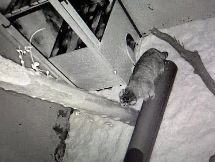 Извините, что заставили вас ждать. Сейчас мы расскажем о состоянии Фиги после первой ночи в зоопарке Ногеяма. В первом отчёте мы показывали вам Фигу в день доставки, когда он отказался выходить из транспортного контейнера. Мы пошли проверить его следующим утром, и вот в каком состоянии экспозиция была на тот момент. Фиги больше не было в транспортном контейнере, и я заметил пустой поднос с едой. Похоже, он съел всю еду, поэтому я успокоился. Давайте посмотрим, как это выглядело ночью на камере видеонаблюдения. Отныне все кадры будут сниматься с камеры видеонаблюдения ночью, поэтому, пожалуйста, извините за чёрно-белые и слегка размытые изображения. В 19: 13 он ненадолго выглянул из коробки. Посмотрите на его первое появление ниже. Он тихо вышел, взял кусочек еды и быстро вернулся в транспортный контейнер. Он проделал это несколько раз и съел всё за 10 минут. Возможно, он был голоден из-за стресса. Примерно к 19: 30 он полностью вышел из контейнера. С этого момента он больше не возвраща