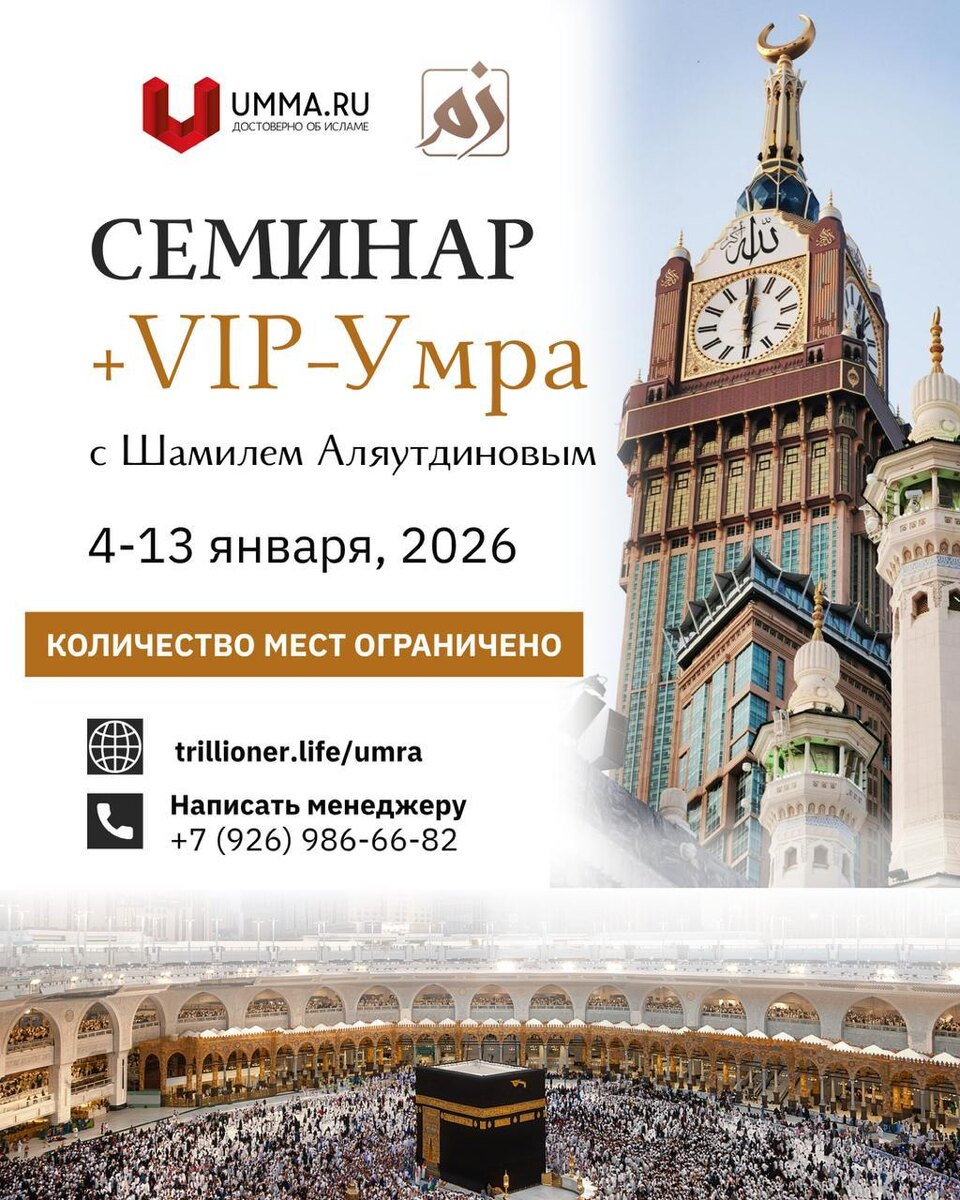 ✨ Семинар и VIP-Умра с Шамилем Аляутдиновым 10 дней, которые соединяют духовное очищение и глубокую работу над собой. 📌 Что ждет участников: — 2-дневный семинар на берегу Красного моря (Джидда). — Умра в Мекке по программе VIP с имамом Шамилем Аляутдиновым. — Посещение священных мест в Медине и Мекке. — Живое общение, наставничество и поддержка на каждом шаге. Эффект «Ракета»: перезагрузка мышления, ясное видение и сила умры, которая наполняет верой и энергией. 🌙 Это не просто поездка. Это шанс вернуться к себе, очистить сердце и укрепить веру, начав новый год с правильного шага. ⚠️ 1 декабря – повышение цены ⚠️ 🌐 https://trillioner.life/umra 📱📱 Написать менеджеру или по 📞+7 926 986-66-82